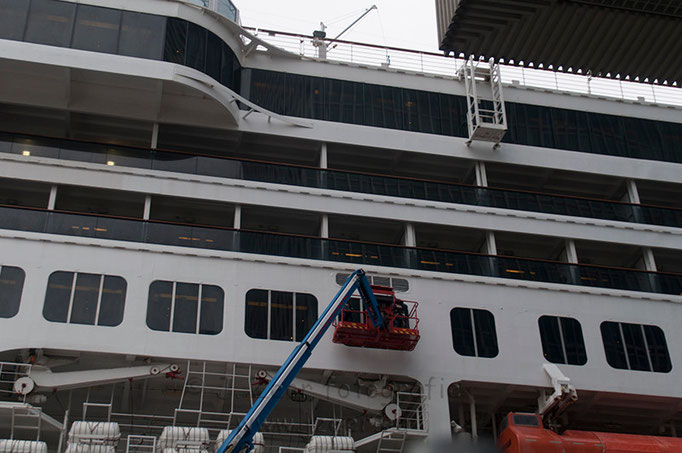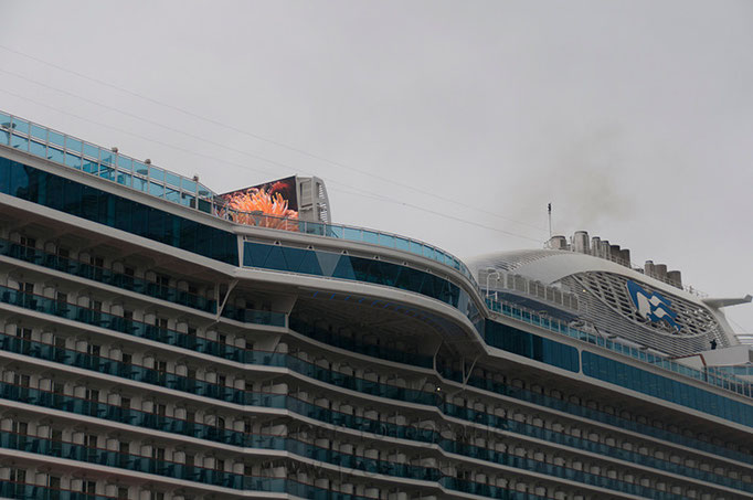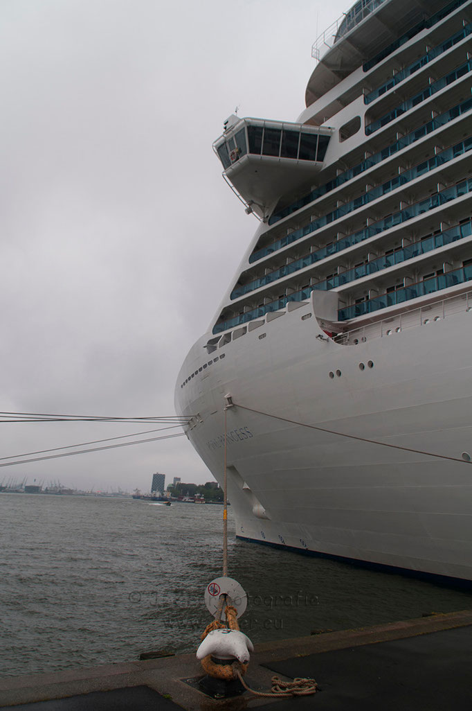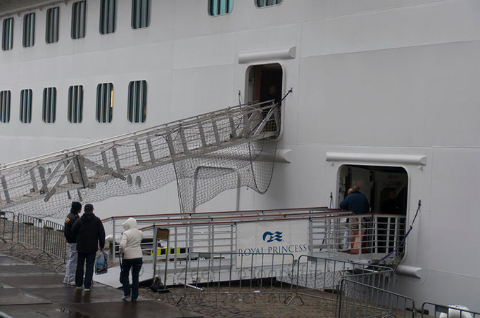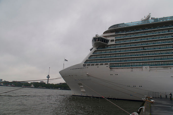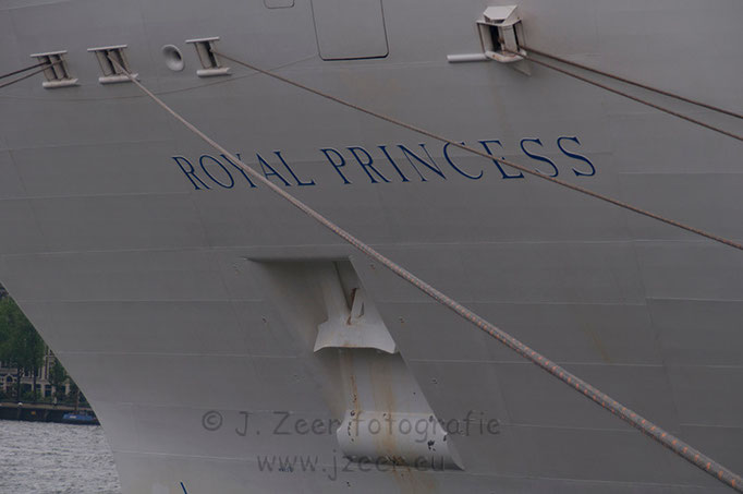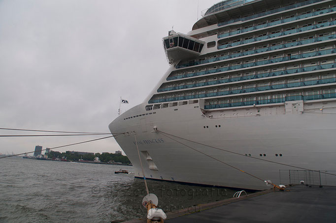 Achter de MS Rotterdam parkeerde rederij Princess Cruises haar vlaggenschip de Royal Princess. Met de konten naar elkaar toe lagen ze aan de Holland America Kade. Dit past net niet, maar een speciale boei bracht uitkomst. Deze boei is voor het laatst 10 jaar geleden gebruikt toen de MS Rotterdam en de MS Stellendam tegelijk aan legden.