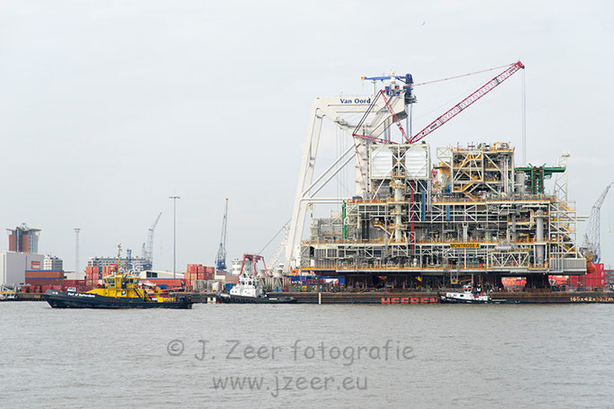 Het toekomstig olieplatform "Montrose A" is gebouwd bij Heerema in Zwijndrecht en voor transport geplaatst op ponton "H-541" van de scheepsbouwer. Gisteren is de combinatie al naar Dordrecht gevaren waarvandaan het vanmorgen vertrok. De combinatie werd geduwd en getrokken door de RT Adriaan en RT Evolution van Kotug.